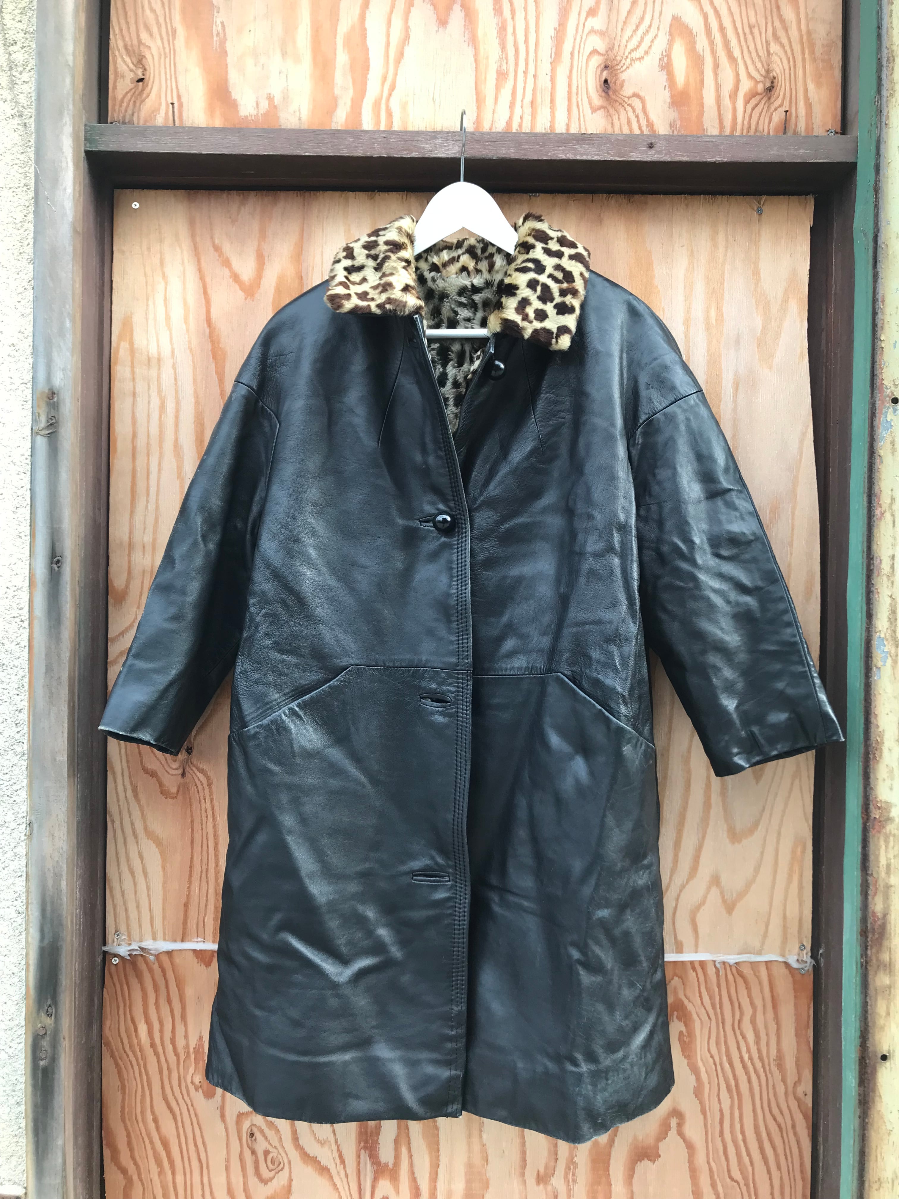 合皮を使用し、インナーには大胆な豹柄が特徴的なデッドストックのロングジャケット。