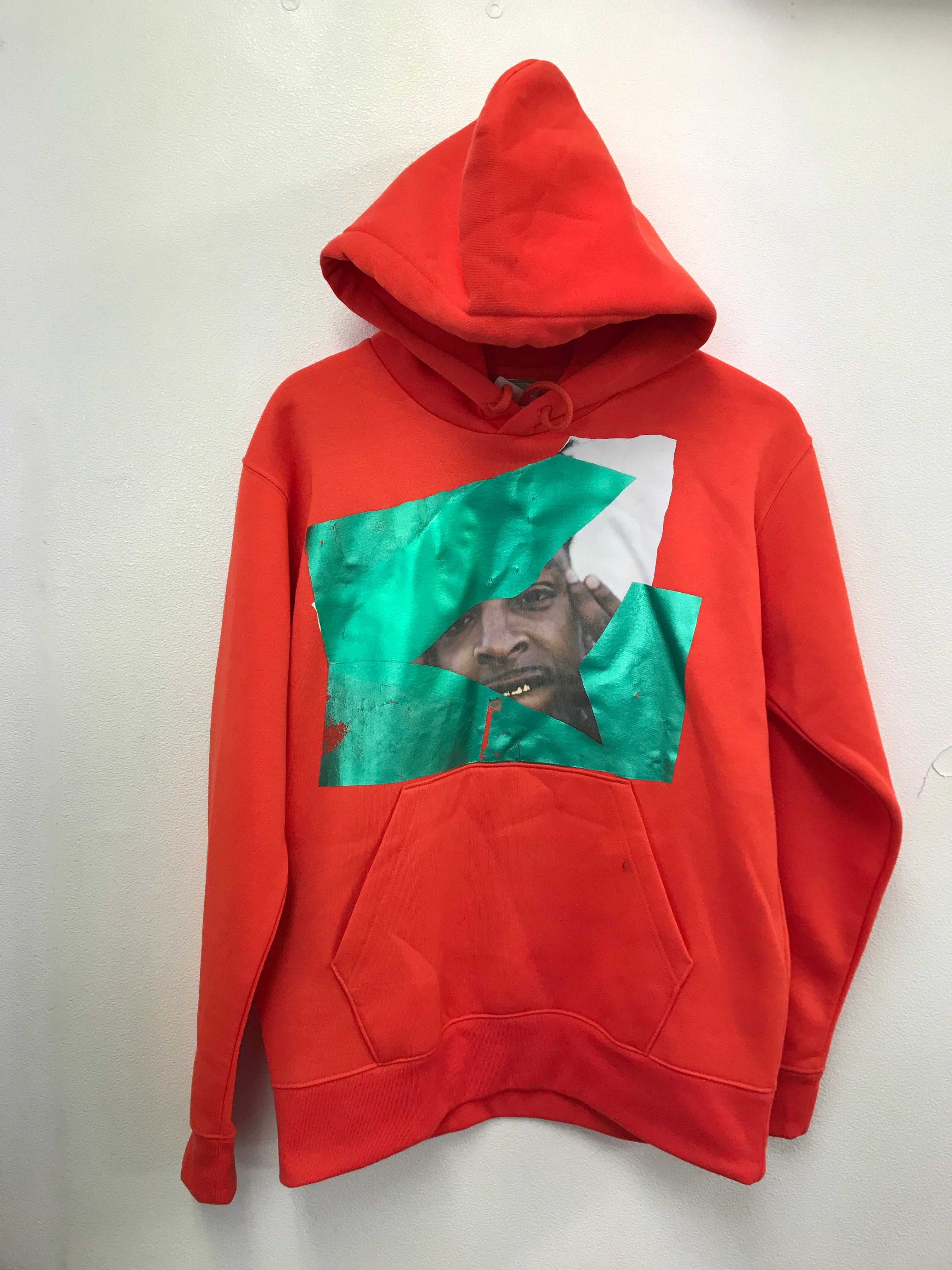 蛍光オレンジのボディに、グリーンのカッティングシートが印象的なパーカー。
